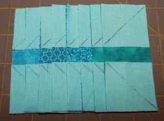 I used four different teals and one light solid for the background. From each of the four prints you will need 3 strips that are 1.5 by 3.5 inches. In addition you will need 4 1.5 inch squares of background fabric for each butterfly (16 total squares).