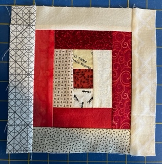 Start round 2 by sewing red 3.5 inch strips to the top and bottom of the completed round 1.
