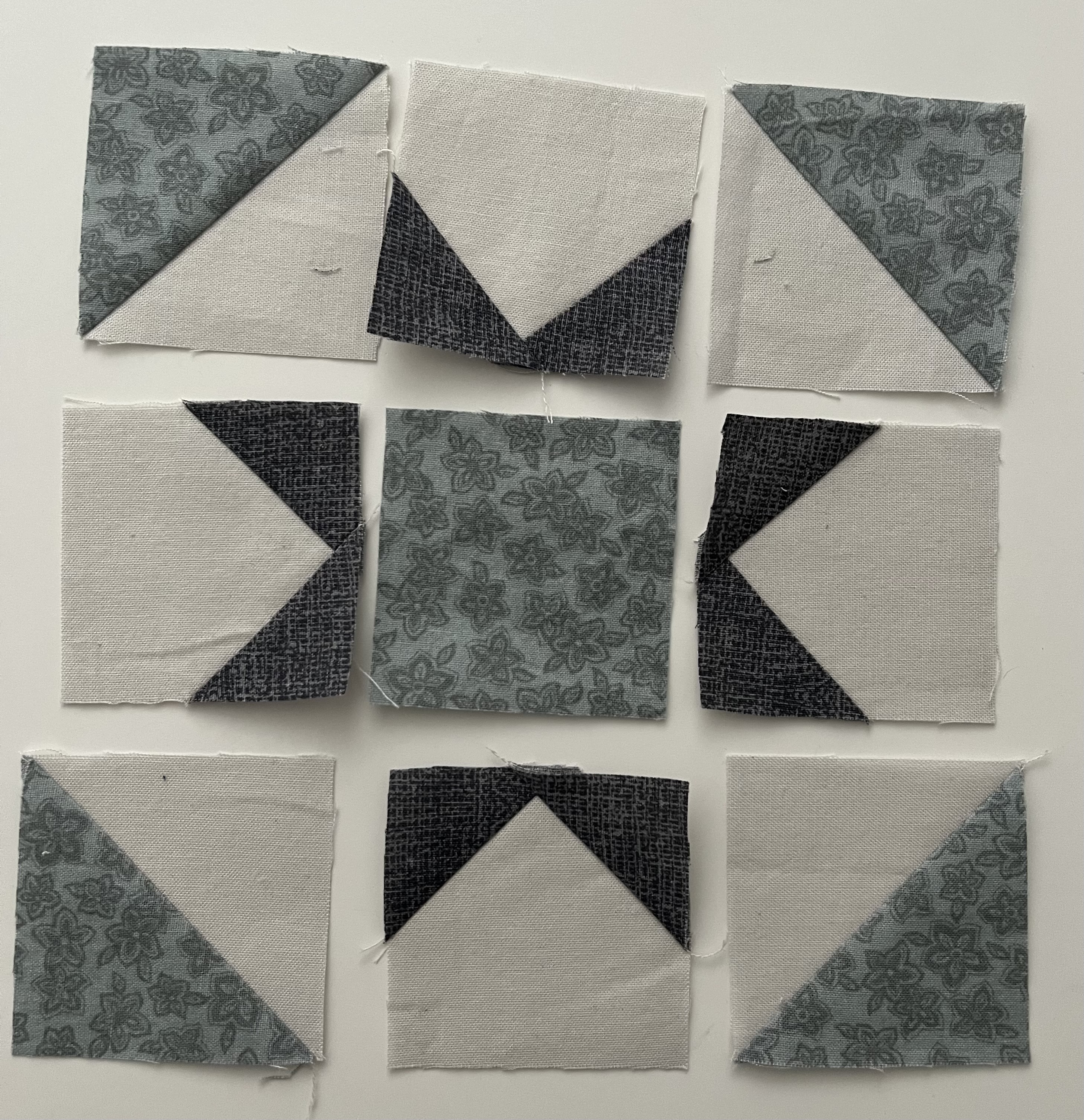 Use the method of your choice to make HST units. Everything else is just a square. I used a light gray for the corners and a darker gray for the star points. The center square can be dark or light gray.
